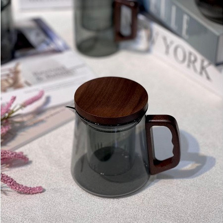 قوری دمنوش پیرکسی دودی رنگ دسته چوبی و فنجان پیرکس چای و نسکافه رنگ دودی با دسته چوبی وارداتی اورجینال